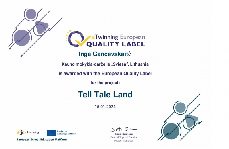 Sveikiname mokytojas, kurioms už projektinę veiklą suteikti Europos kokybės ženkleliai. Virginijai Paužienei už darbą eTwinning projekte „Mažas vaikelis taria skambų žodelį-a small child says a beautiful words” , Ingai Gancevskaitei „Tell Tale Land“ , Rasai Plesevičienei „105 small steps for Lithuania“ suteikti Europos kokybės ženklelis. Tai reiškia, kad mokytojų darbas, mokinių darbas ir bendradarbiavimas su partneriais atitiko Kokybės ženklelio sistemos kriterijus ir gavo aukštą balą.