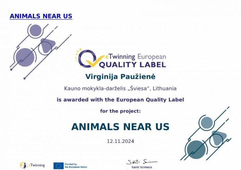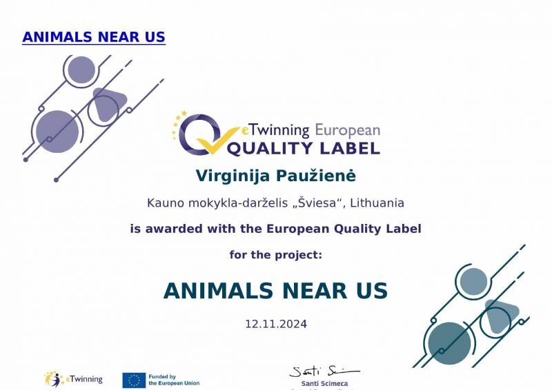 EQl(Europos kokybės ženklelis) už tarptautinį projektą ” Animals near us”